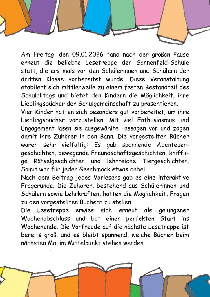 Lesetreppe der Klasse 3: Ein gelungener Wochenabschluss Von Antje MeuerAm 9. Januar 2026In Aktuelles, Klassen erstellt mit Canva