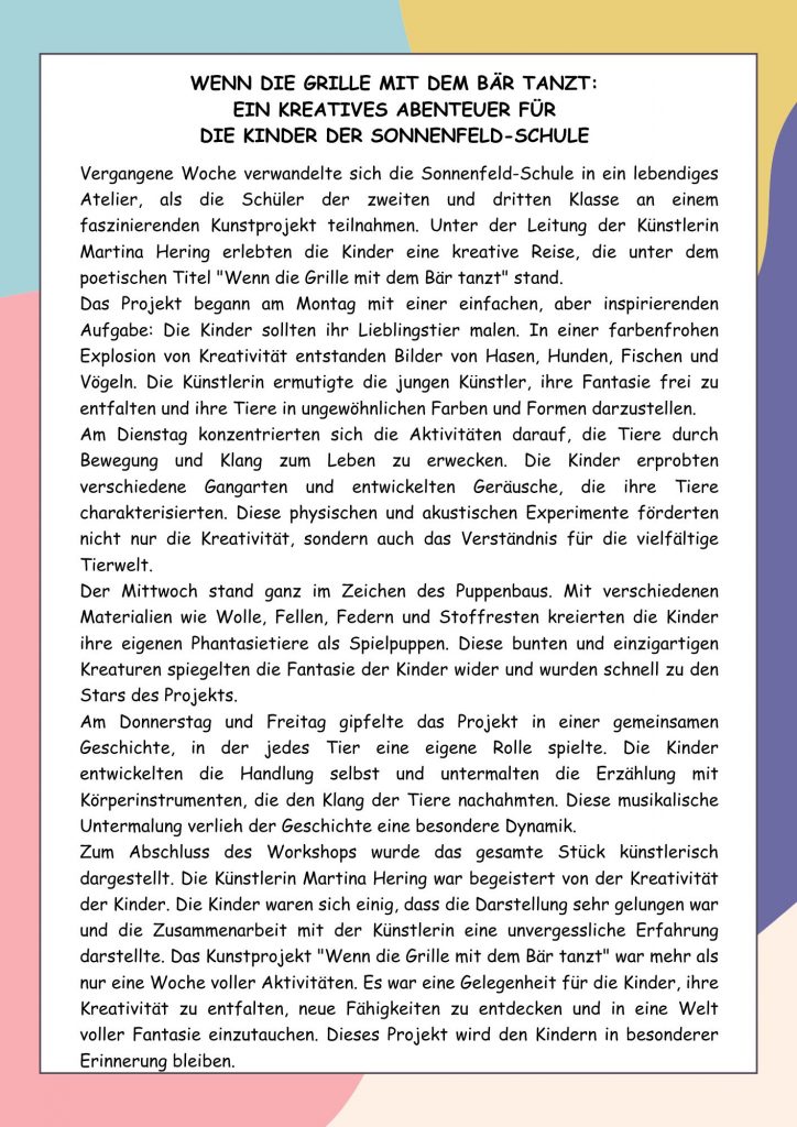 Wenn die Grille mit dem Bär tanzt: Ein kreatives Abenteuer für die Kinder der Sonnenfeld-Schule Von Antje MeuerAm 14. September 2025In Aktuelles, Klassen erstellt mit Canva